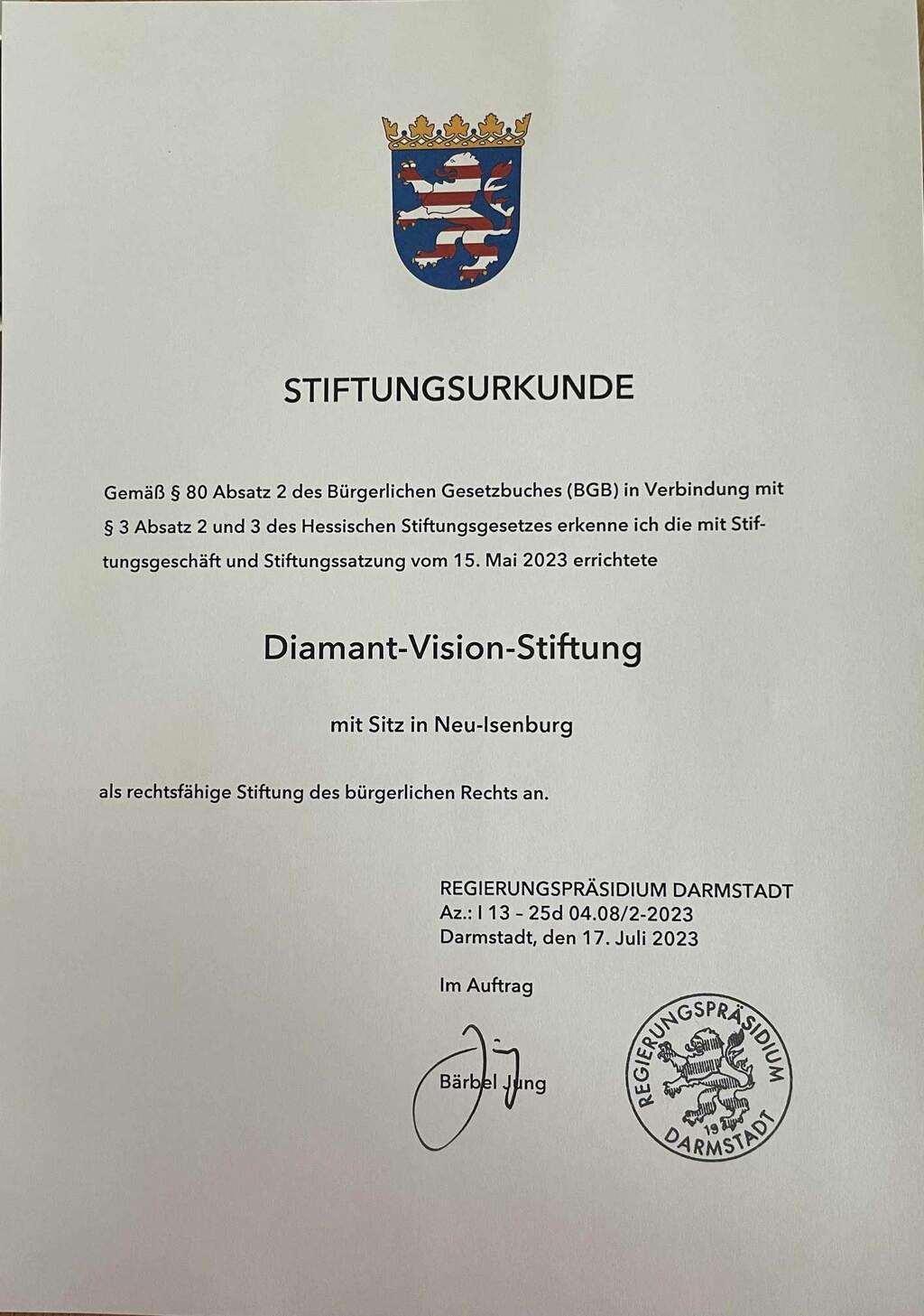 Diamant-Vision-Stiftung wurde im Jahr 2023 durch den Vorstand-Vorsitzenden Dipl. Kfm. Robert Brachfeld ins Leben gerufen. Diamant-Vision ist eine gemeinnützige Stiftung, die auch einen jährlichen Schmuckwettbewerb mit grossartigen Preisen finanziert und veranstaltet. DV unterstützt Werke und Personen im kulturellen und künstlerichen Bereich. Der besondere Schwerpunkt liegt auf den Goldschmiedarbeiten und -creationen.